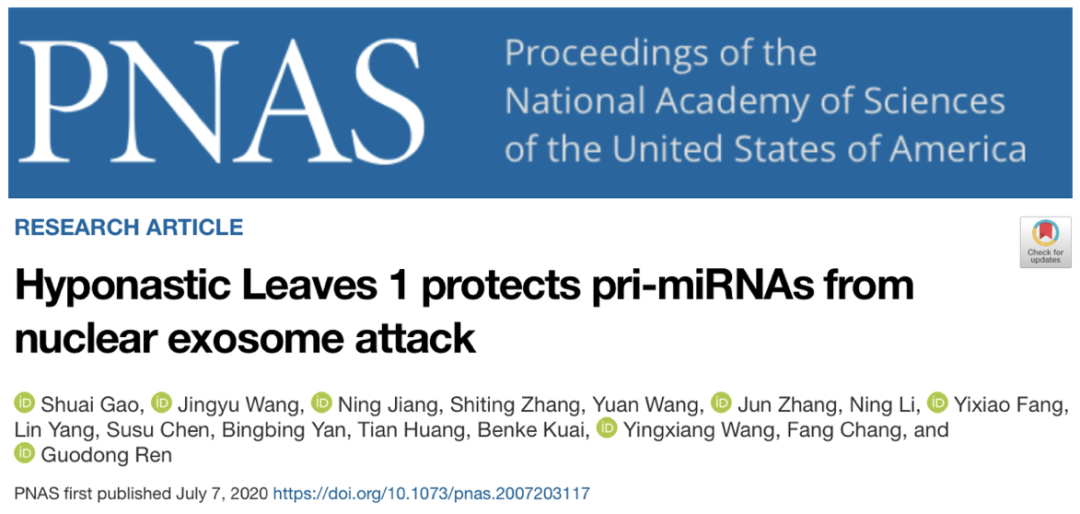 7月7日,复旦大学生命科学学院、遗传工程国家重点实验室研究员任国栋课题组在《美国科学院院刊》(PNAS)上发表了题为《双链RNA结合蛋白HYL1保护miRNA前体分子免受核内外切体攻击》(“Hyponastic Leaves 1 protects pri-miRNAs from nuclear exosome attack”)的研究论文。影响因子为9.412。