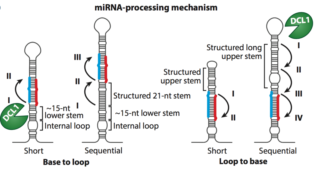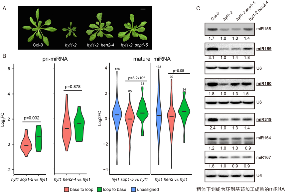 该研究揭示了拟南芥双链RNA结合蛋白 HYL1在 miRNA加工成熟过程中保护底物分子(pri-miRNA及其加工过程中间产物)免受核酸外切体(exosome)攻击的新机制,并发现HYL1可能在DCL1介导的由环到基部(Loop-to-base)和基部到环(Base-to-loop)成熟的pri-miRNAs 加工过程中发挥不同作用。