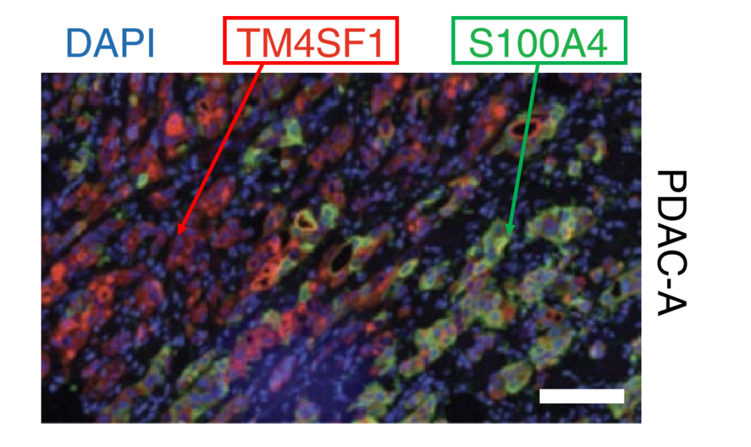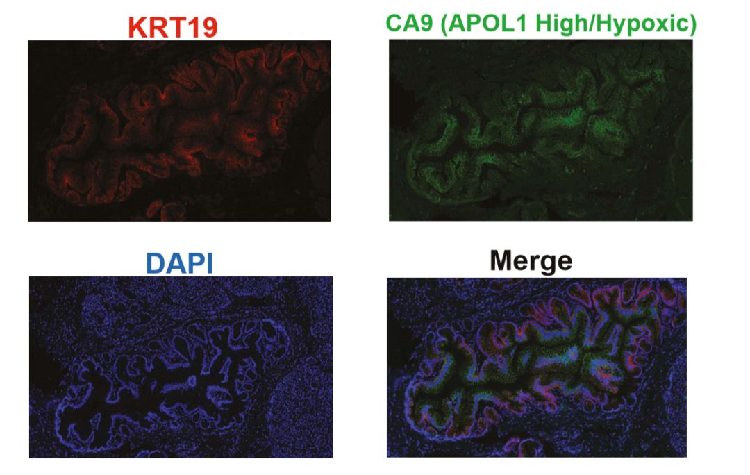 有意思的是,这些APOL1高表达的导管细胞,因为是导管细胞,所以正常情况下是应该出现在导管部位,而作者发现这个亚群的细胞却主要出现在癌症组织中