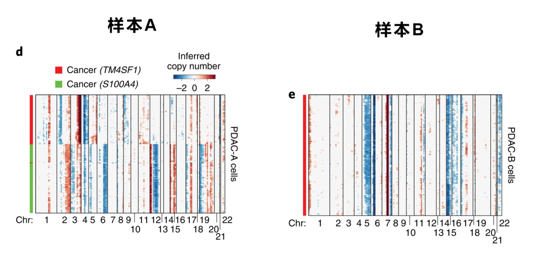 在样本A当中发现两个簇的细胞有拷贝数变异,在样本B当中有一个簇的细胞有拷贝数变异。
