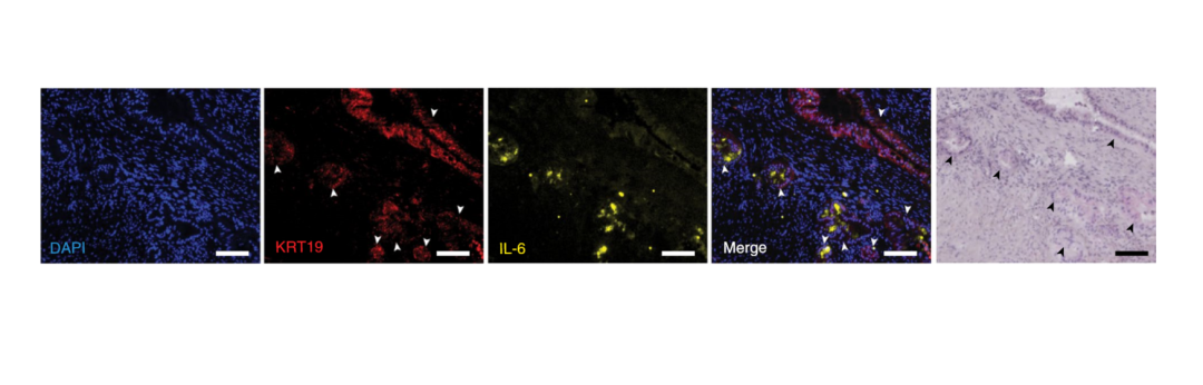 为了进一步验证炎性成纤维细胞与癌症组织的关系,作者又对样本中白细胞介素6和K蛋白做双色荧光染色。