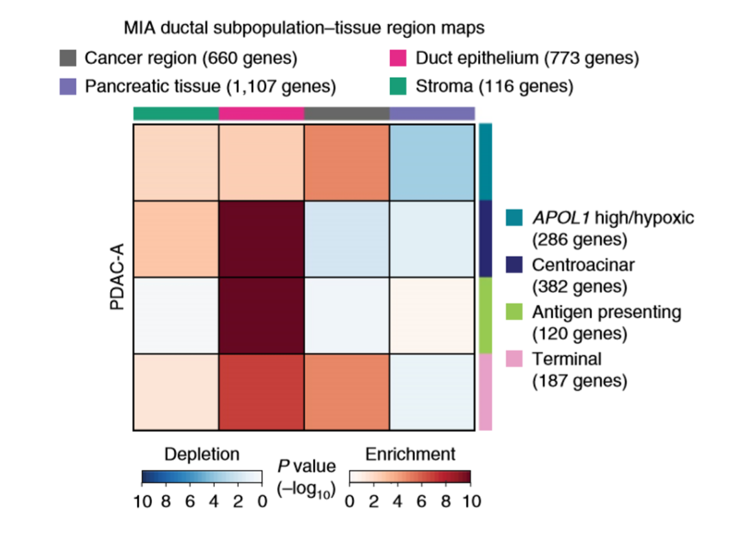 比较特别的是这一块,因为它是导管细胞的一亚群,所以,按常理来说,应该是导管上皮细胞这一块富集程度高,也就是这块的颜色理论上应该更偏棕色,但我们看到实际情况是它在癌组织区域有富集,这与我们之前观察到的,APOL1高表达的导管细胞出现在癌组织区域的情况,是一致的。