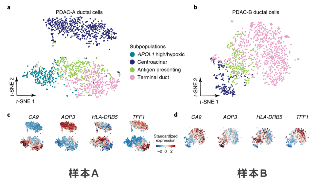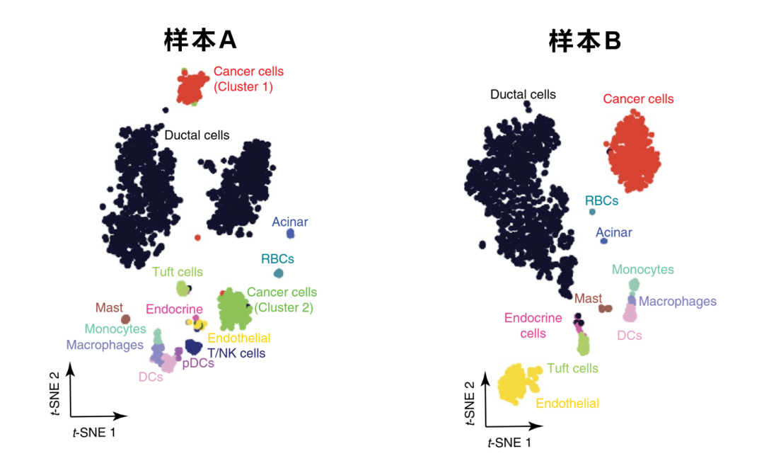 样本A和样本B中,都有导管细胞,作者把这两个样本中的导管细胞数据拿出来,再做进一步的细分