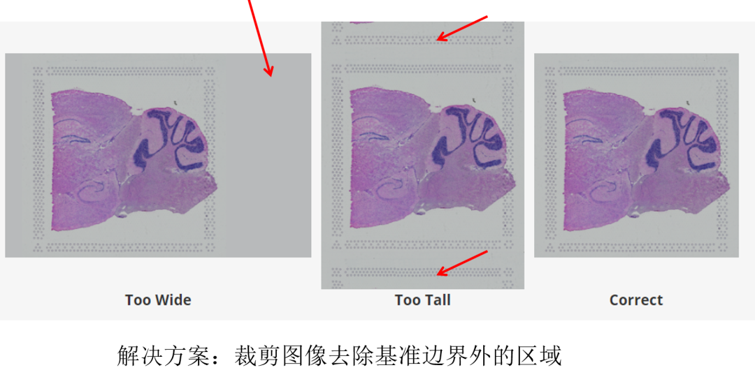 捕获区域的左侧或右侧有大量空白,或者含有其它样本捕获区域的一部分,可能会导致基准对准或组织检测结果不符。建议裁剪图像以去除基准边界外的区域。