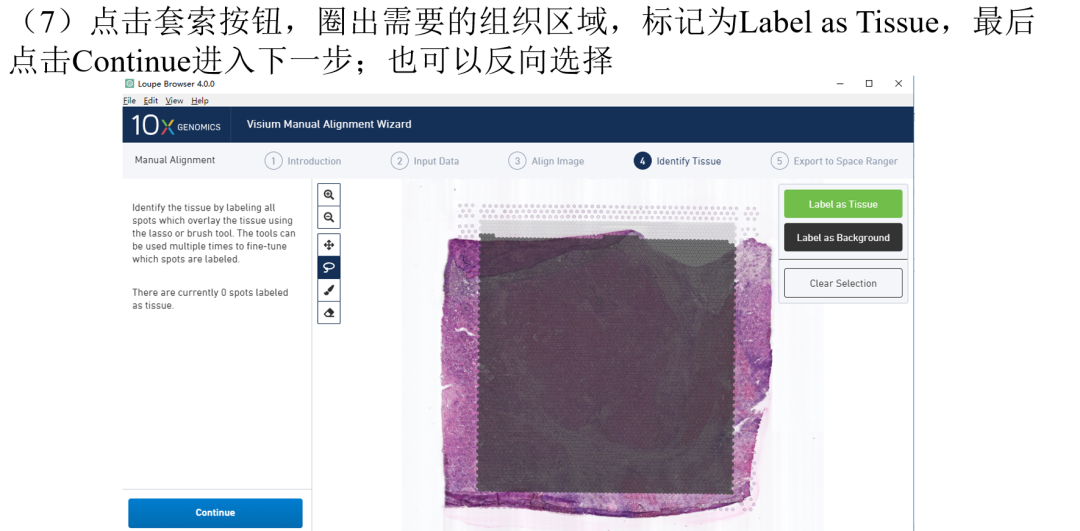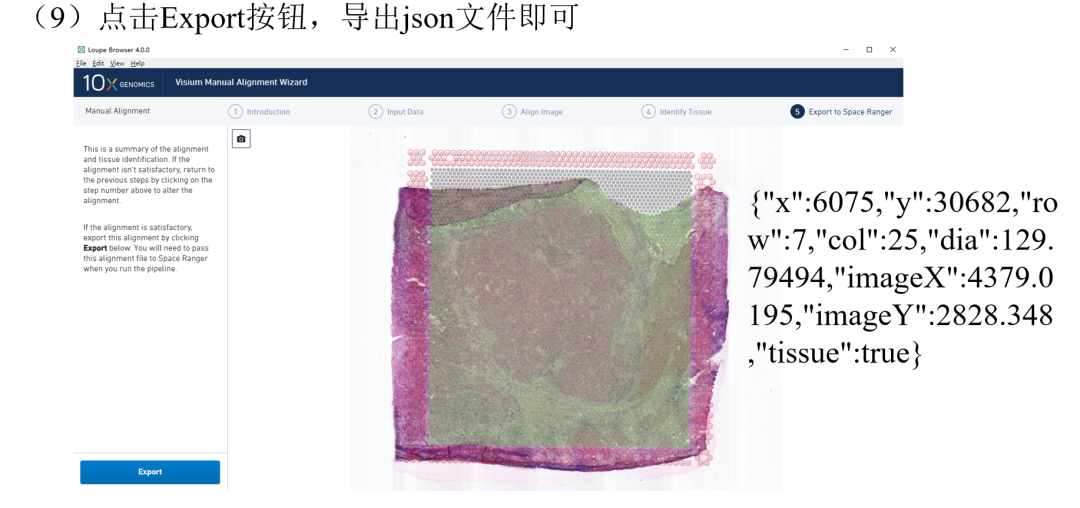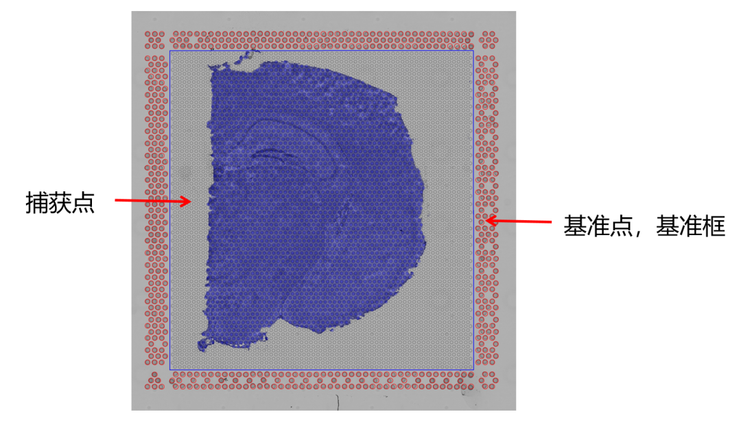 第三部分描述是识别出来的组织区域及spots详细信息,图中红色框就是基准框,捕获区域内蓝色区域即是自动识别出来的组织区域。