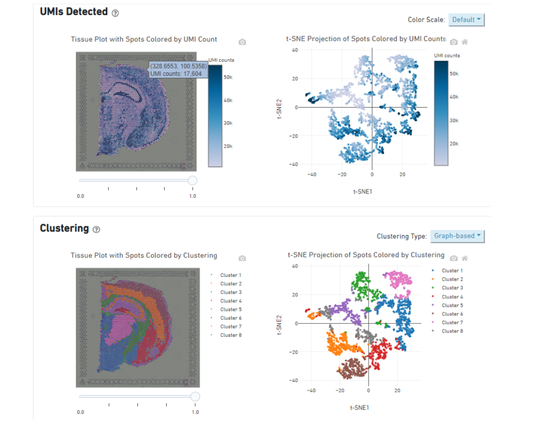我们继续看analysis部分:聚类结果通过绘制二维的TSNE布图进行结果展示,图中每个点表示一个spot。上面这张图颜色的深浅表示检测到的UMI数量高低,颜色越深检测到UMI越高。下面这张图则是用不同的颜色代表不同的cluster;左边的图组织切片空间位置分布图,同理,上图颜色的深浅表示对应位置检测到的UMI数量高低,下图不同的颜色表示不同的cluster。这样的话,将spatia barcode对应的空间位置与基因表达量,聚类结果相关联起来。