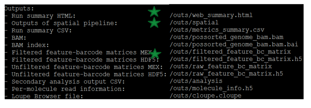 space ranger count命令输出结果保存在一个outs目录下,文件非常多。为了方便查看结果,提供了一个所有结果汇总的html页面,即web_summary.html。spatial目录储存着spatial barcode 空间位置信息;filtered_freature_bc_matrix储存着spotXgene定量结果;analysis目录储存着数据降维,聚类及差异分析结果;cloupe.cloupe用于可视化,可以用loupe browser打开,查看基因的表达,辅助鉴定细胞类型,创建和修改子群,差异分析等操作。这里呢重点介绍三个文件:web_summary,html,spatial目录和filter_feature_bc_matrix目录。