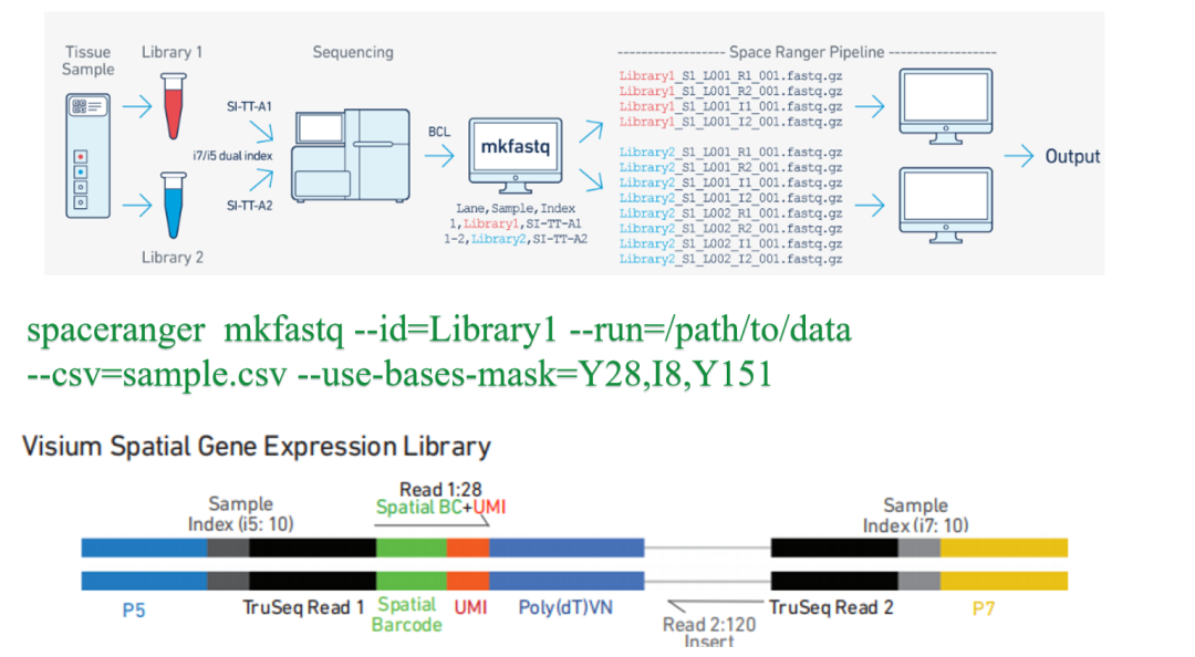 mkfastq命令实现功能是将测序议产生的bcl格式转换为fastq格式,生成三类fastq压缩文件R1,R2,I1;R1read1端测序数据,R2reads2短测序数据,I储存sample index 信息;操作命令非常简单,就一条命令,里面有一个参数非常重要--use-bases-mask=Y28,I8,Y151,行命令的意思就是Reads1截取28bp,reads2截取151bp,sample index序列截取8bp,为什么这么做呢,我们看一下构建好的文库结果,这是reads1测序起始点,测到的是spatial barcode, UMI,poly(T)序列,只有前28bp才是有用信息。这是reads2测序的起始位点,因此只有reads2测到的是转录本序列
