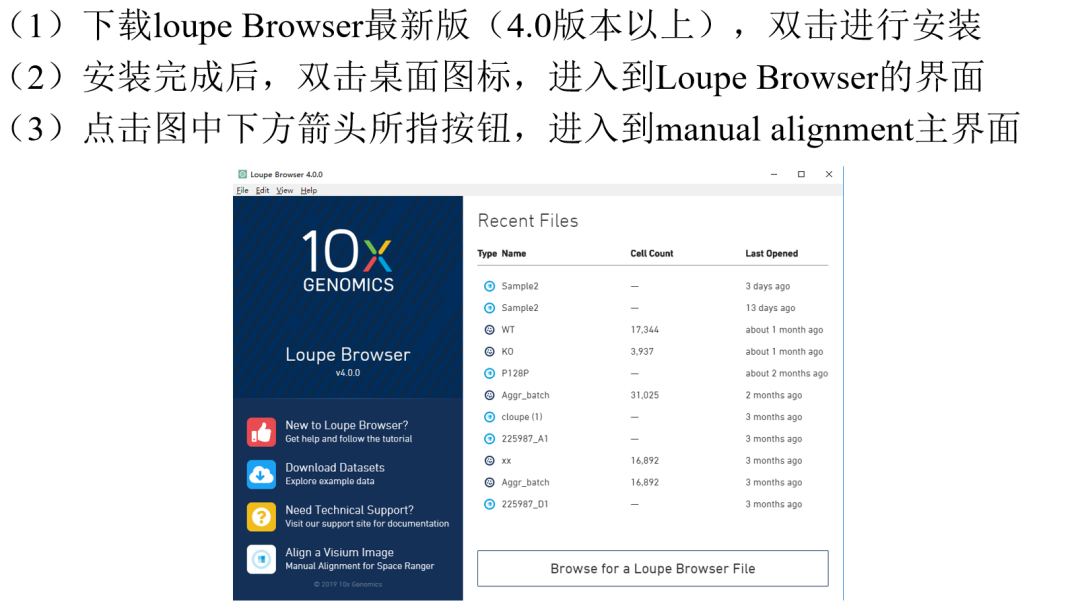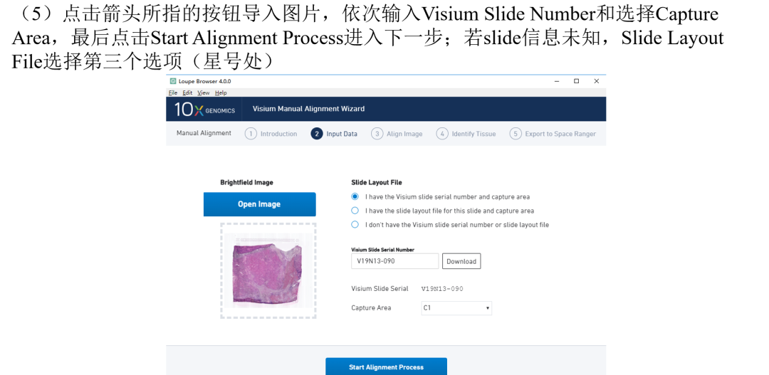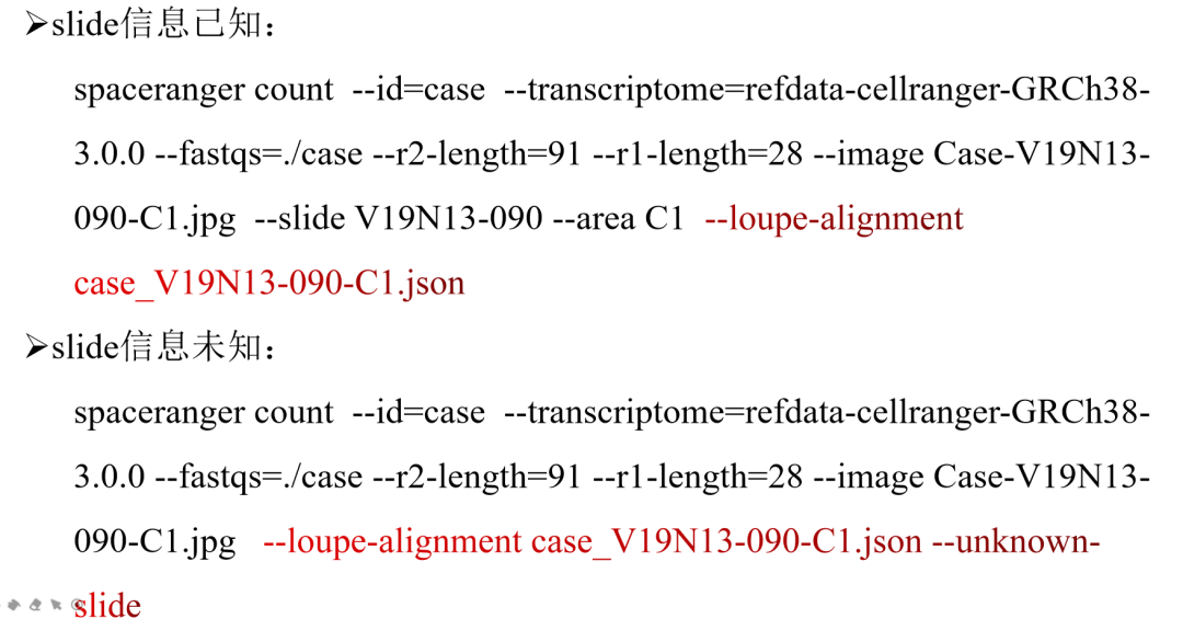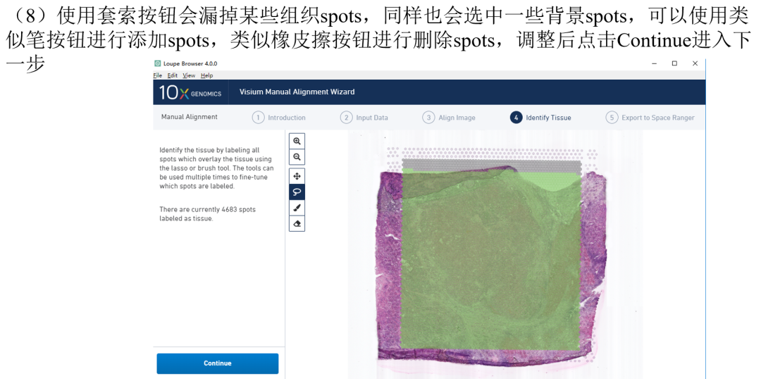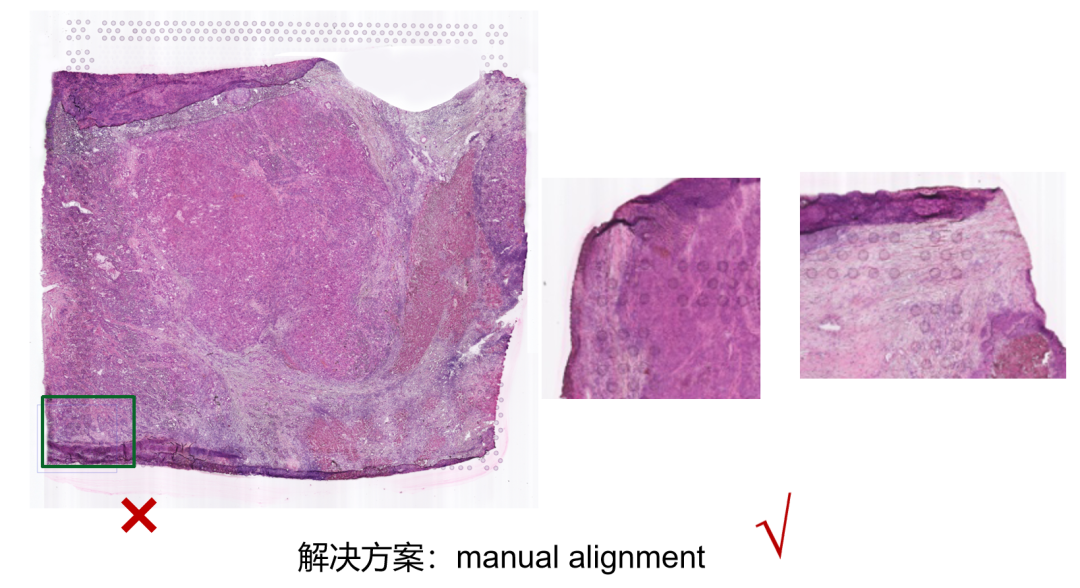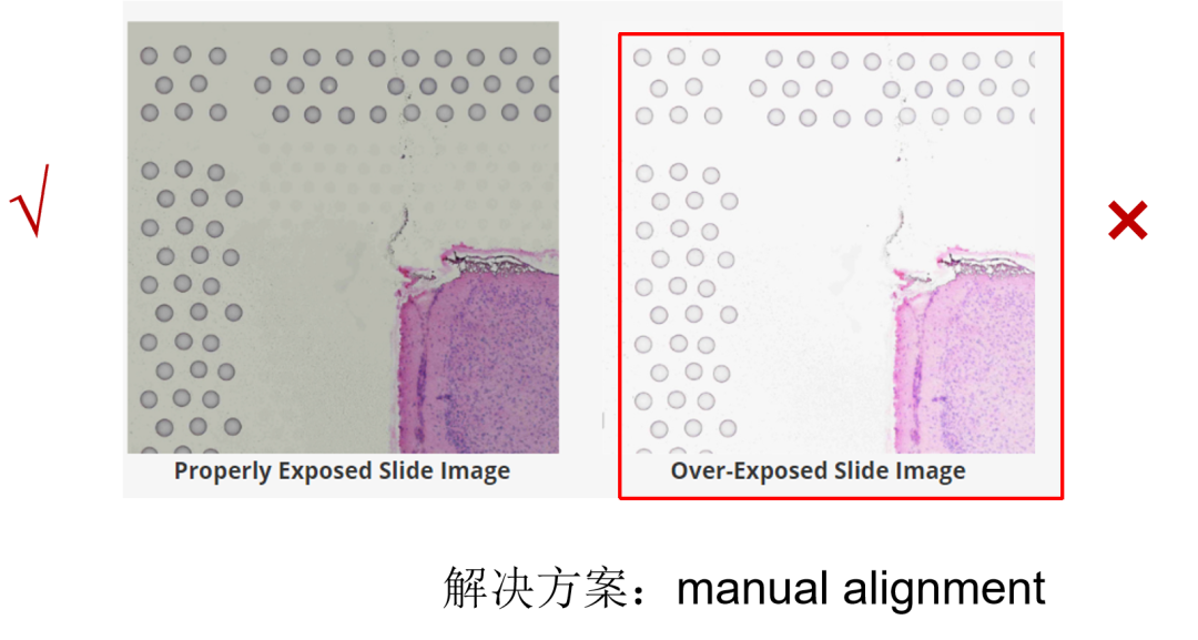 space ranger识别组织区域时,主要依靠四个点,如果这四个点被组织区域覆盖掉,那么space ranger可能无法识别出组织区域。左图左下角这个角肉眼无法识别出,这种情况下一般space ranger也识别不出来。但像右边这种情况,四个角虽然被被组织区域覆盖掉,肉眼基本可以识别出,space ranger也可以识别出来。一旦遇到组织区域无法识别时,就可以通过loupe browser进行图片manual alignment