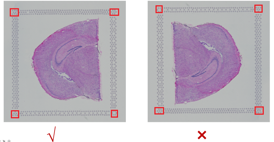space ranger识别组织区域时,主要依靠基准点对齐,基准筐四个角的形状是固定的,输入的图片必须保证方向是正确的,即左上角是沙漏型,右上角是实心六边形;右下角是空心六边形,左下角是三角形。如果方向不对,用ps调整一下即可