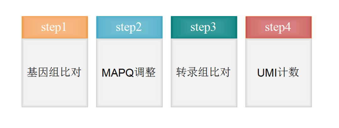 第四步UMI计数:主要有两个校正过程(1)对UMI碱基进行校正:主要校正UMI中的测序错误(2)对基因进行校正:保留多数reads支持的基因注释