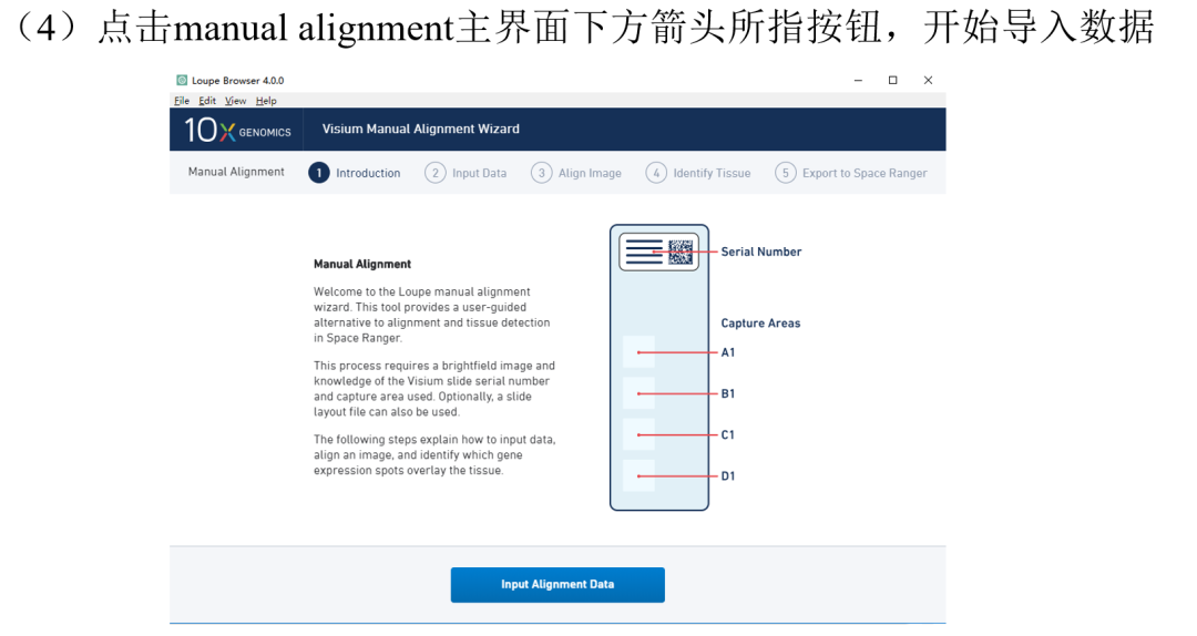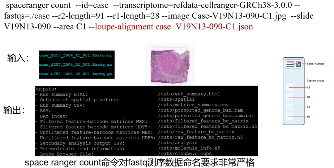 这张芯片最上面有个serial number ,这是每个visium波片上印刷的唯一标识符,四个捕获区域,从上倒下一次标记为A1,B1,C1,D1;如果space ranger无法自动识别出组织区域,需要manual alignment导出json文件,人工识别组织区域。这里特别提示以下:space ranger count命令对fastq测序数据命名要求非常严格。