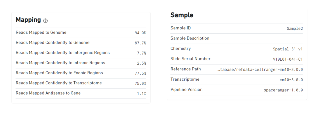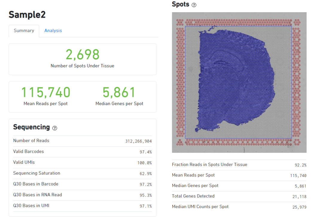 web_summary.html的结果分成了summary和analysis两部分,summary主要是一些描述信息,比如识别出来的组织区域spots数,检测到的基因数目,测序质量,reads比对情况等信息。我们分别详细介绍一下。