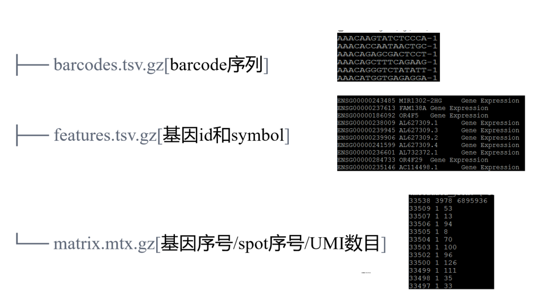 filtered_feature_bc_matrix目录包括barcodes.tsv.gz,features.tsv.gz,matrix.mtx.gz三个文件。barcodes里面储存spatial barcode ID,features文件储存检测到的基因id和symbol。matrix.mtx.gz是关于基因,Spot表达矩阵。第一行三个数字分别表示这个样本检测到了基因,spots和UMI总数。从第二行开始,第一列表示基因序号,二列表示spot序号,第三列表示检测到UMI数目。举例说一下,33509 1 53表示在features文件里第33509那个基因在第一个spot检测到的UMI数目是53。第一个spot对应的就是features文件第一个spatial barcode ID。