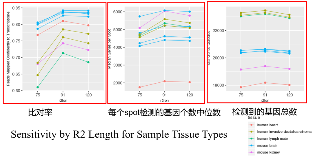 10Xgenomics公司选取了人和小鼠五个数据集,read2的长度分别设置为75,91,120bp,分别统计每个数据集的比对率,绘制折线图。从图中可以看出read2设置91bp时,比对率最高;按同样的方法统计每个spot检测的基因个数中位数。同样在read291bp时,每个spot检测的基因个数中位数最高,这是因为测序过程中,随着试剂的消耗,reads测序末端质量偏低,引入碱基错误,同样reads2设置不能过短,reads可以比对到基因组多个位置,表面上比对率提高,但是mulit-mapped reads在UMI计数时也会过滤掉,造成资源浪费